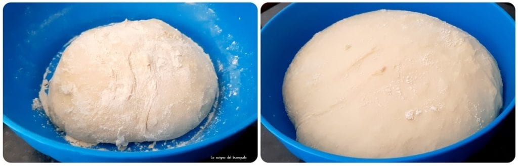 Once risen, pour the dough onto a work surface and divide it into 4 equal parts, create 4 balls and let them rest for at least 30 minutes.