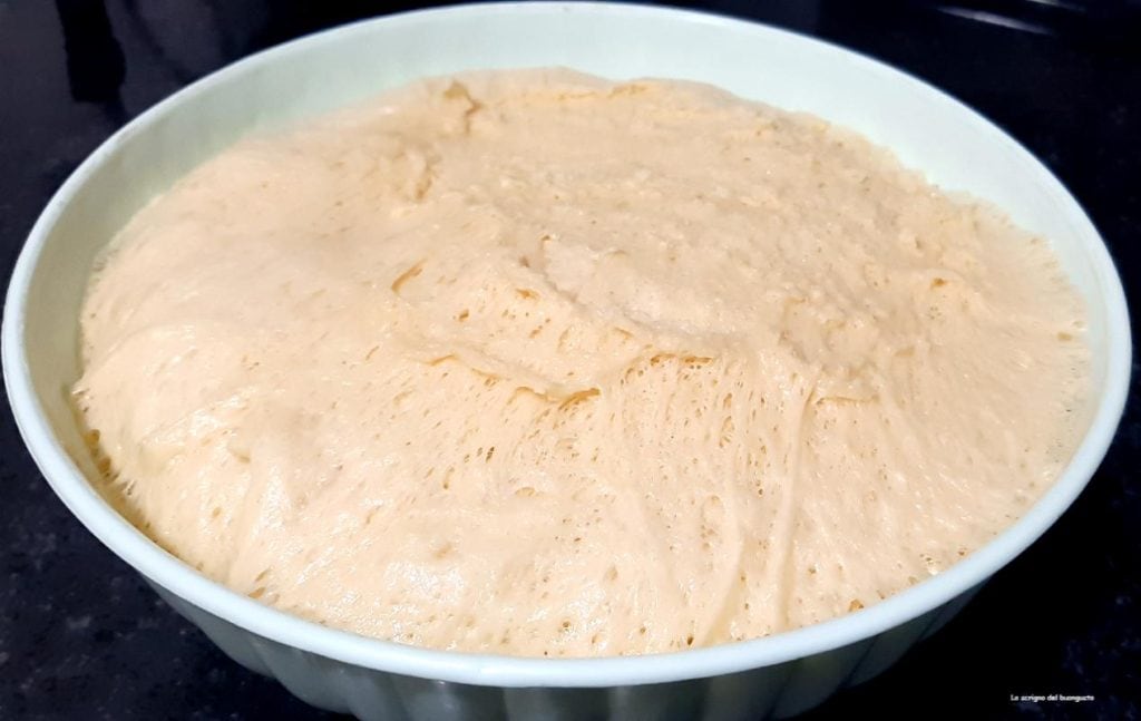 For the first dough, dissolve the 5g of yeast in a tablespoon of lukewarm water and then add it to the risen starter, start kneading by adding a bit of flour, then add an egg, softened butter, milk, and finish kneading with the flour provided for the first dough.