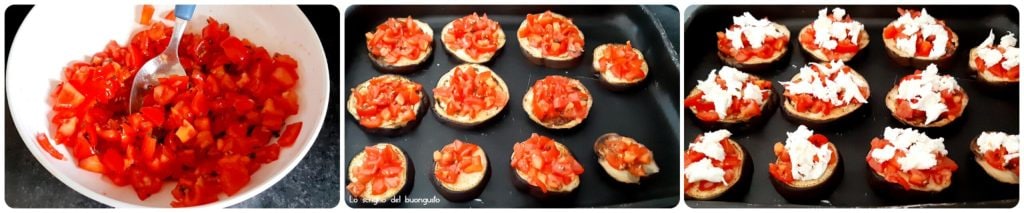 Dress the eggplant slices with the prepared tomato, then crumble a little mozzarella on top and bake in a preheated oven at 392°F for about 15 minutes, checking the cooking.