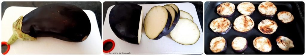 Take the eggplants, wash them, remove the green part at the stalk level, slice them to about one finger’s thickness, and grill them for 2 minutes on each side, just to dry them out a bit and make them grilled but not too dark. Set aside on a baking sheet for cooking.