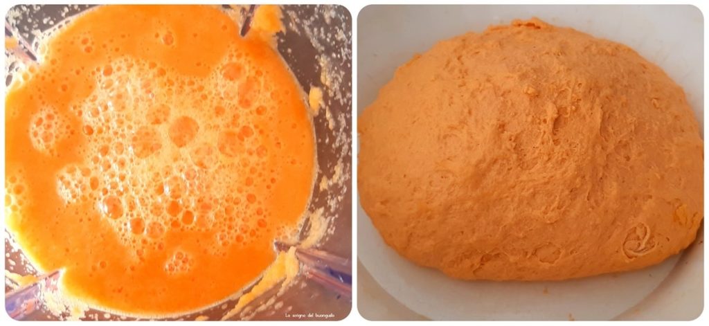 You will obtain a sort of watery mixture, pour it into the bowl where you will make the dough, add the fresh yeast, dissolve it and add half the flour of the expected amount, starting to work the dough with a spoon.