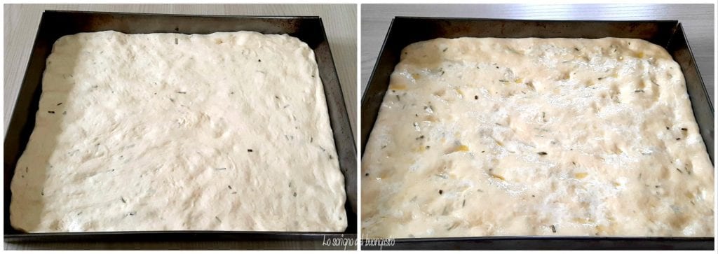 After the time has passed, take the dough, stretch it by hand, and place it in a greased baking pan measuring approximately 12×14 inches. Brush the surface of the focaccia with olive oil and sprinkle with salt.
