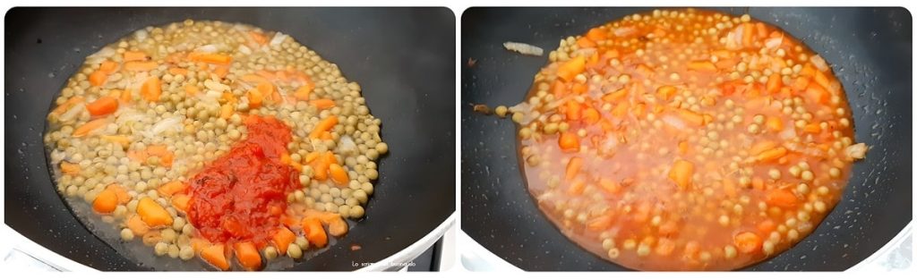 • In a non-stick pan, add the oil, finely chopped or blended onion, and lightly sauté it, then add the steamed carrots and peas and mix, add water and bring to a boil.