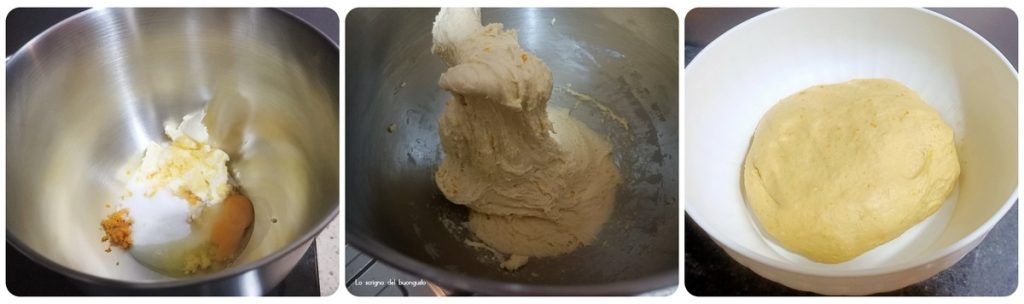 • After the rising time, add the eggs one at a time, the sugar, the grated lemon and orange zest, the softened butter and the flour little by little, mixing well each time.