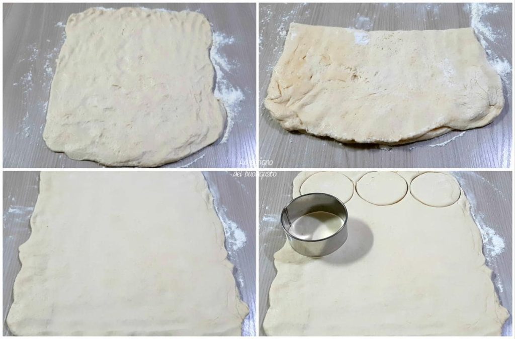 Dust the rolled-out dough and fold it in half, then roll it out again and repeat the operation before rolling out the dough for the last time to a thickness not too thin, at least 3/8 inch, and cut circles with a pastry cutter.