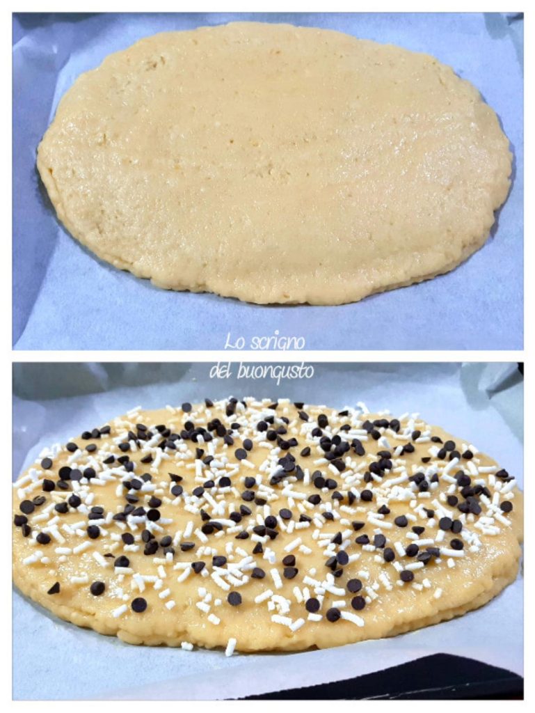 Seal the edges well with your fingers, then brush the surface with the yolk and milk mixture, sprinkle with white sugar pearls and chocolate chips.