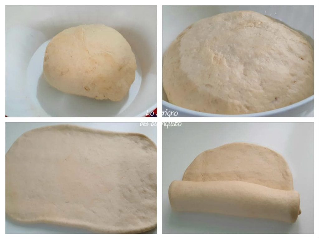 After that time, take the dough and transfer it to a work surface without kneading it further, roll the dough out with a rolling pin to form a rectangle, then roll it up on itself.