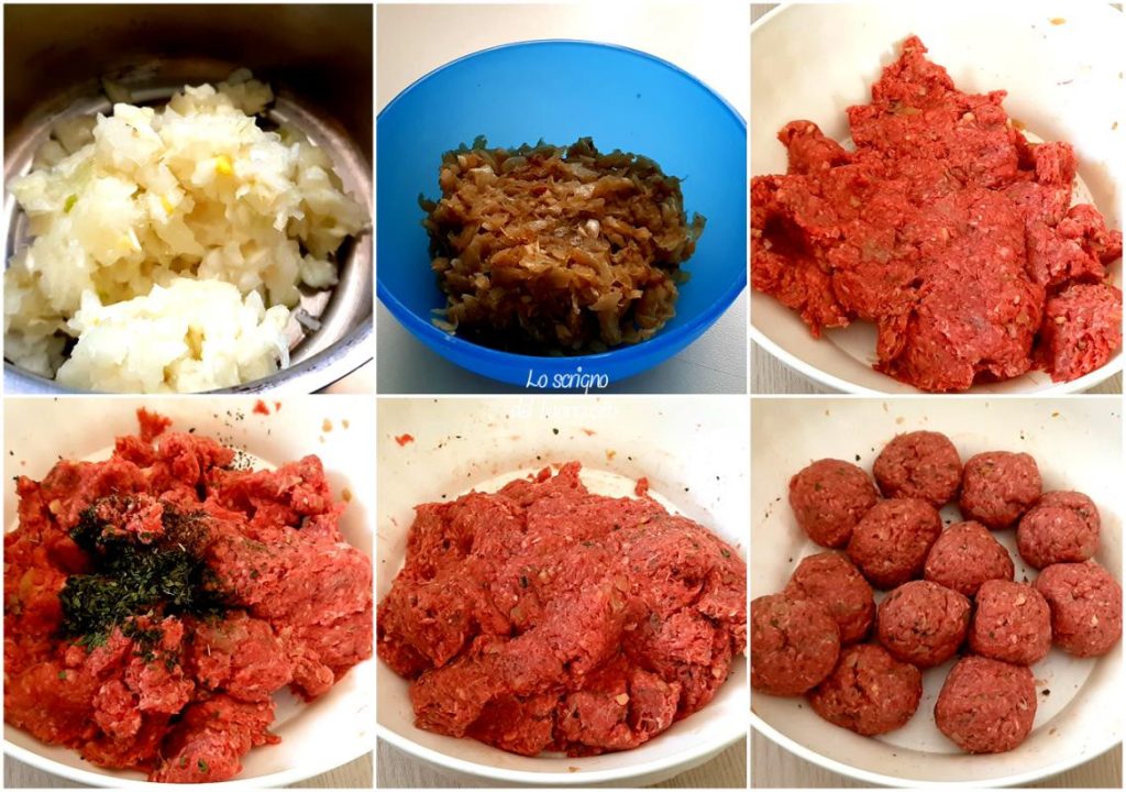Put the minced beef and lamb in a bowl, season with salt and pepper, add the cooled sauté, and mix well.