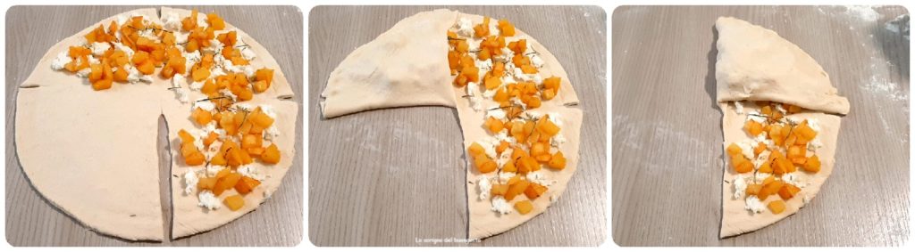 Fill 3 sections of the circle and then close the pizza onto itself from left to right as shown in the photo.