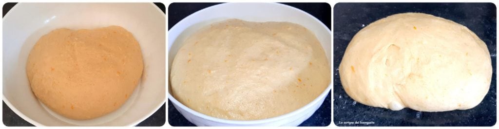In the meantime, prepare the stand mixer (if you can make the dough with a stand mixer it’s better, otherwise use elbow grease by hand), add the juice and grated zest of the orange, the vial of orange blossom water, eggs, sugar, softened butter, and “0” flour, mix well for a few minutes.
