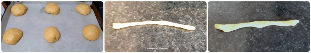 With the leftover dough, once you’ve created the balls, make thin strips of dough and press them with a finger in three points, in the center and towards the two ends….