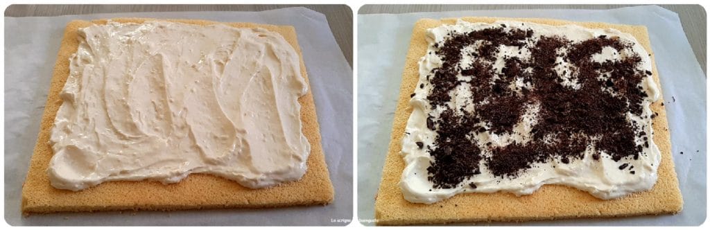 At this point, we pour the chantilly cream on the roll base, leveling well and leaving about a finger from the edge, keeping 2-3 tablespoons of cream aside for the finishing.