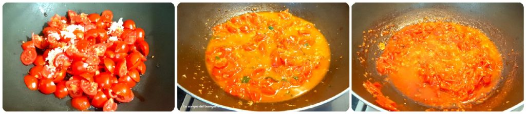 In a non-stick pan, put the oil, grated garlic cloves, washed and chopped cherry tomatoes, and begin cooking, stirring occasionally.