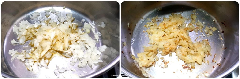 • In a steel pan with high sides, place the coarsely chopped onion with the e.v.o. oil, fry a bit while stirring
