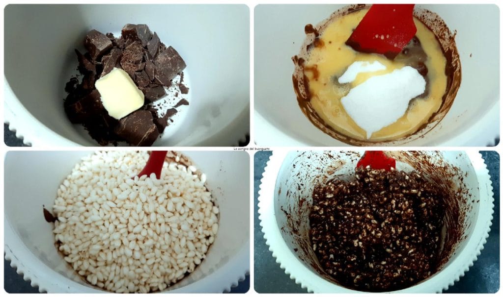 In a bowl, put the dark chocolate and butter, melt them in the microwave, then add the egg, sugar, mix again, and add the puffed rice, mixing everything well.