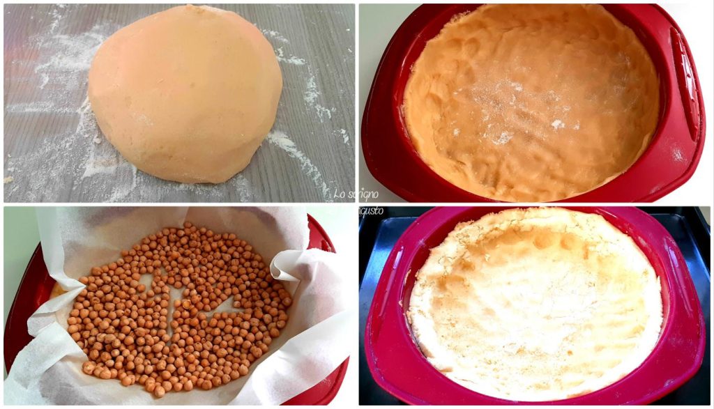 On the base of the pastry, place chickpeas or beans directly on the pastry, or with a sheet of parchment paper and bake in the oven for 9-10 minutes at 350°F.