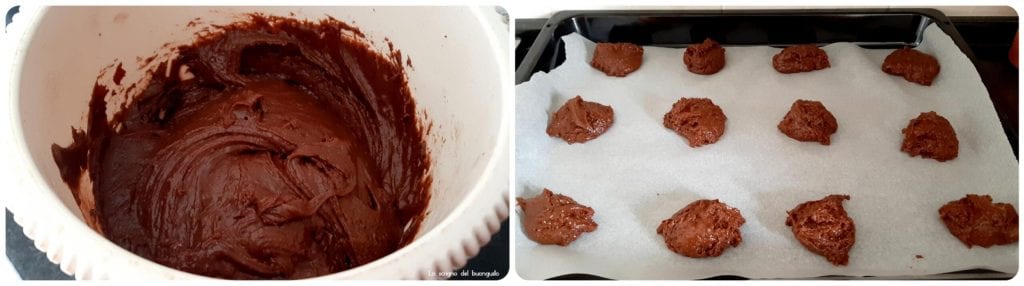 Meanwhile, prepare the baking trays where we will cook the cookies, line them with baking paper and after the time in the fridge, place the mixture for our cookies on the tray with a spoon, spacing them a bit from each other.