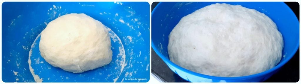 After the time has passed, dust the surface of the dough and detach it from the sides of the bowl, take a baking sheet lined with parchment paper or floured and pour the mixture for our bread trying to give it a loaf shape with your hands.