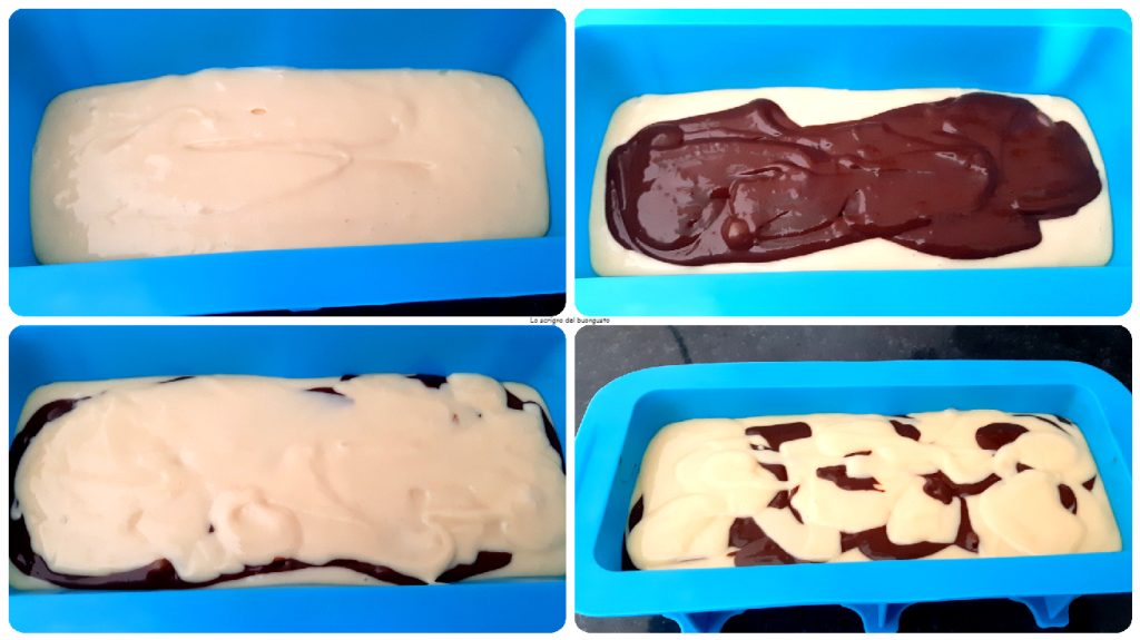 Pour a part of the mixture into the mold starting with the light one, then add some of the cocoa one, alternating until all is used.