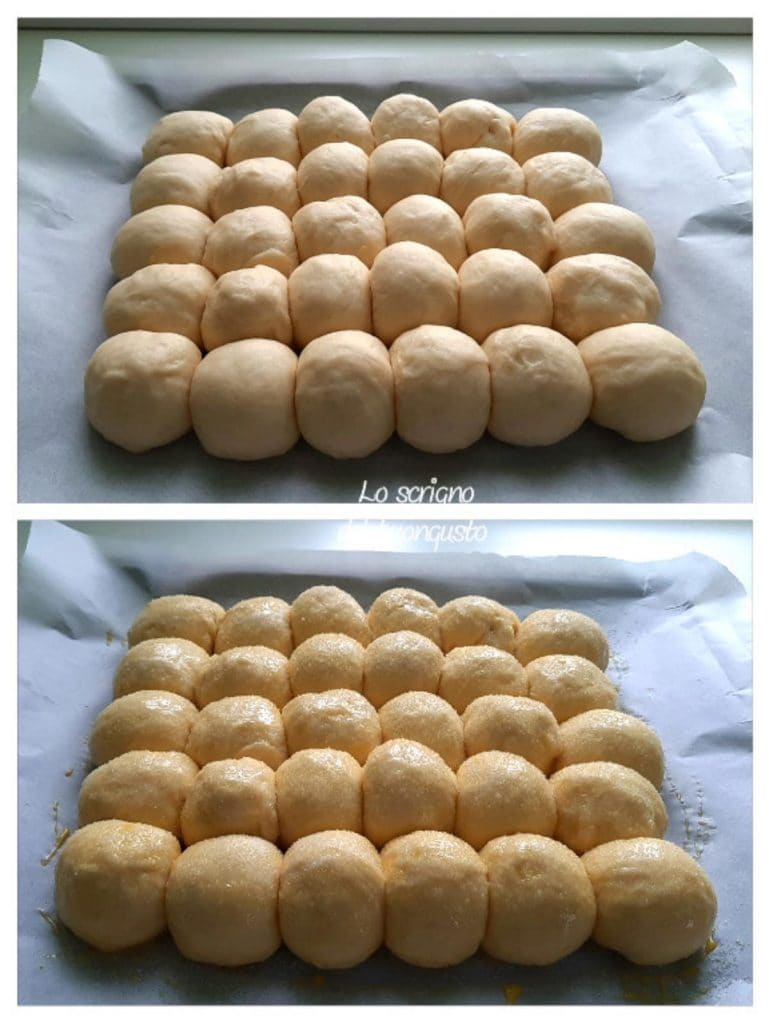 Place the balls next to each other in rows of 6, and let them rise again for about 1 hour in a warm place or with the oven light on.