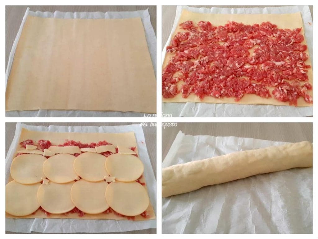 Take the puff pastry sheets, spread them out, and fill them on the longer side with a layer of sausage meat, leaving a three-finger width space free on the long side (see photo).