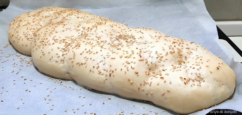Once risen, brush the surface of our braid with milk and sprinkle with sesame seeds.