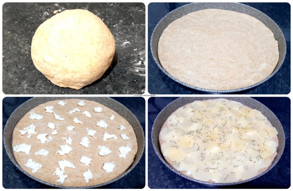 Place the crumbled mozzarella on the pizza surface, then the potatoes, and finally drizzle with extra virgin olive oil, salt, and sprinkle with rosemary.