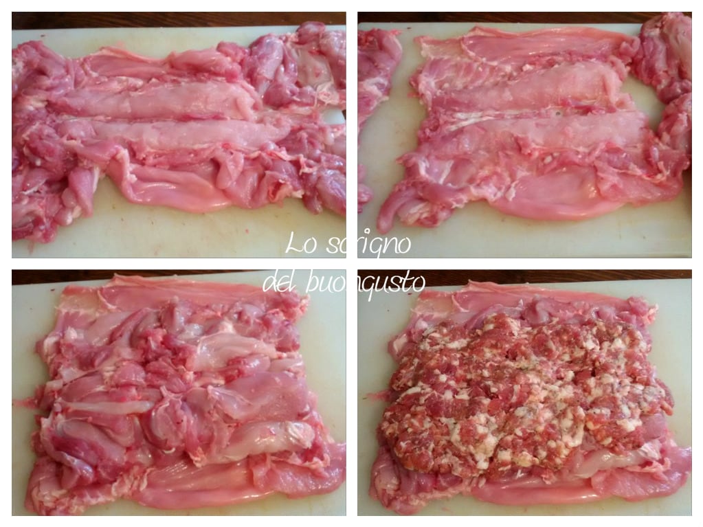 Once deboned, it will be open and flat; at this point, lightly sprinkle with salt, cut off the protrusions of the 4 legs, 2 on one side and 2 on the other, and place them inside the rabbit, then add the sausage meat, which is well-seasoned enough not to need additional seasoning, finally wrap the rabbit onto itself from the widest part.