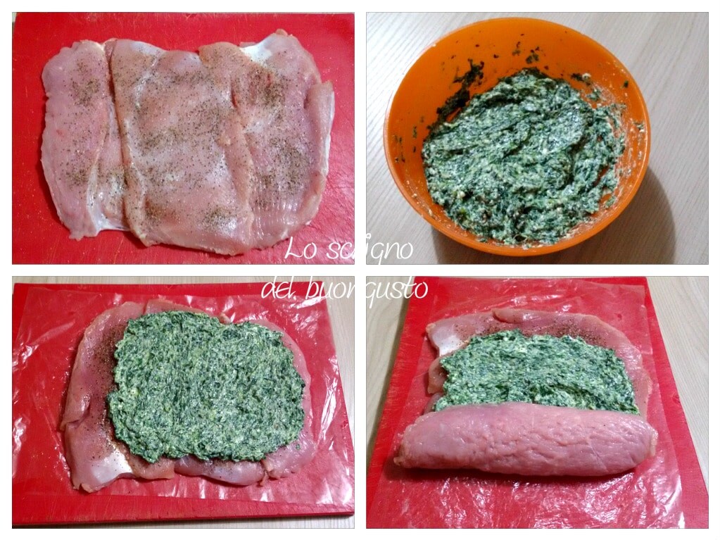 At this point, sprinkle the meat with salt and pepper, then spread the spinach mixture over it and roll the meat onto itself from the wider side, tie the roll with kitchen string.