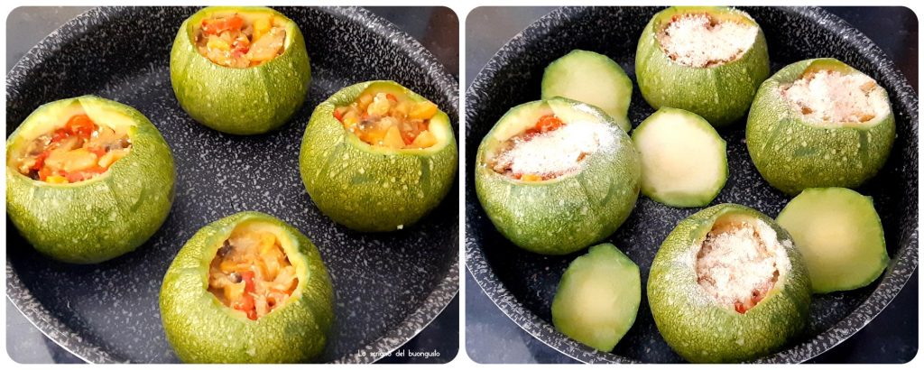 I blanched the zucchinis for 5-6 minutes after hollowing them out, to prevent them from being too crunchy after cooking.