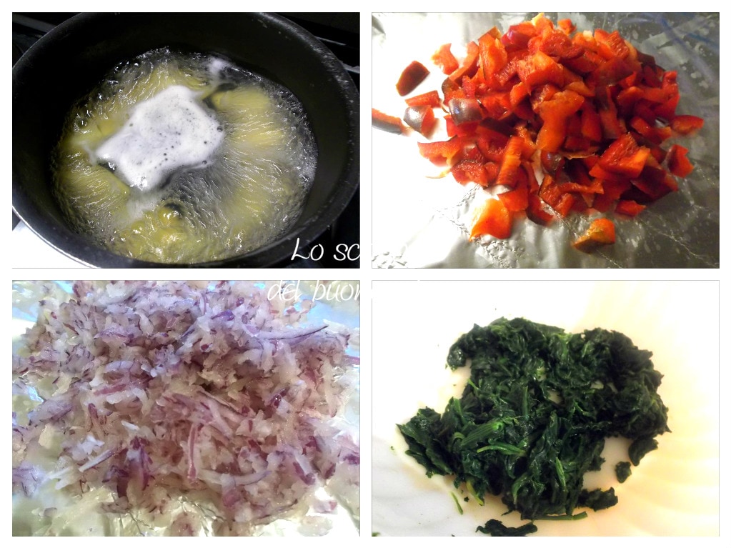 • First, boil the potatoes, cut the vegetables into small pieces, and set them aside separately, chop the spinach.