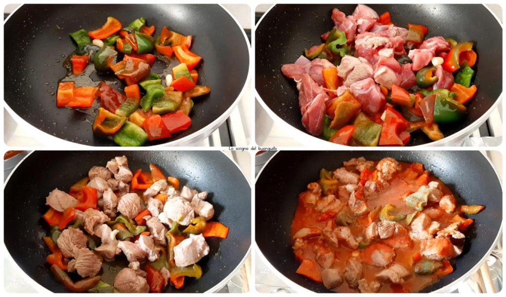 In a non-stick pan with high edges, put the extra virgin olive oil, the peppers cut into pieces previously washed and deseeded, the meat, and let it cook over medium heat for about ten minutes, stirring often.
