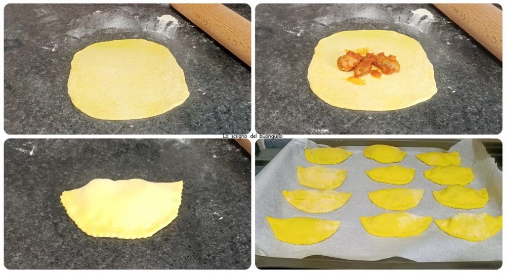Once sautéed with garlic and spices, the filling should be well sealed inside the pizza-dough discs to prevent the juices from escaping during cooking.