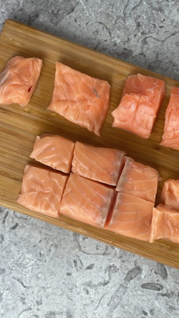 Mix well to combine all the ingredients and set aside.Cut the salmon fillets into chunks, remove the skin with a knife if present.