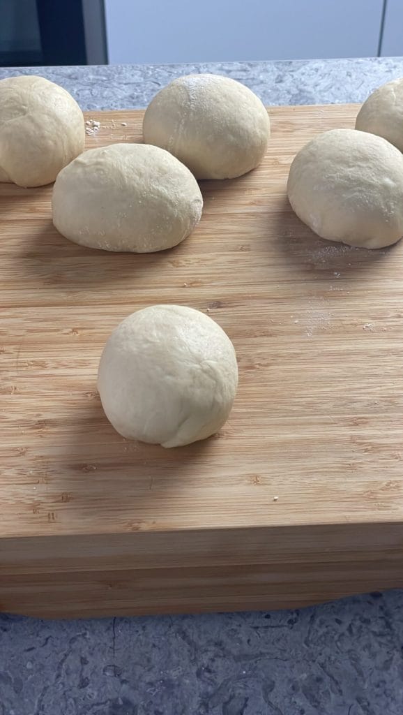 With a dough scraper, cut portions of about 80g (approximately 2.8 oz), you should get around eight.