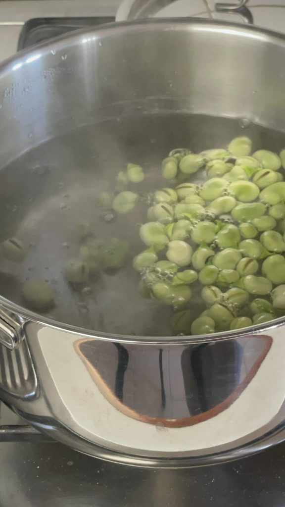 Bring a bit of water to a boil, add the fresh fava beans, and cook them for 20 minutes.