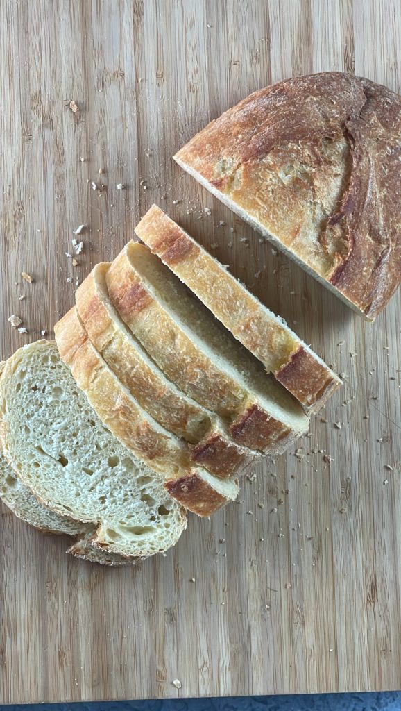 Start preparing the bruschettas with brie and dried figs by cutting the rustic bread into slices about 0.4 inches thick.