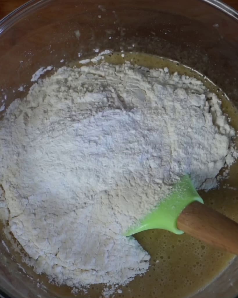 Also add the previously sifted flour and baking powder to the bowl and mix with a spatula until you get a smooth, lump-free mixture.