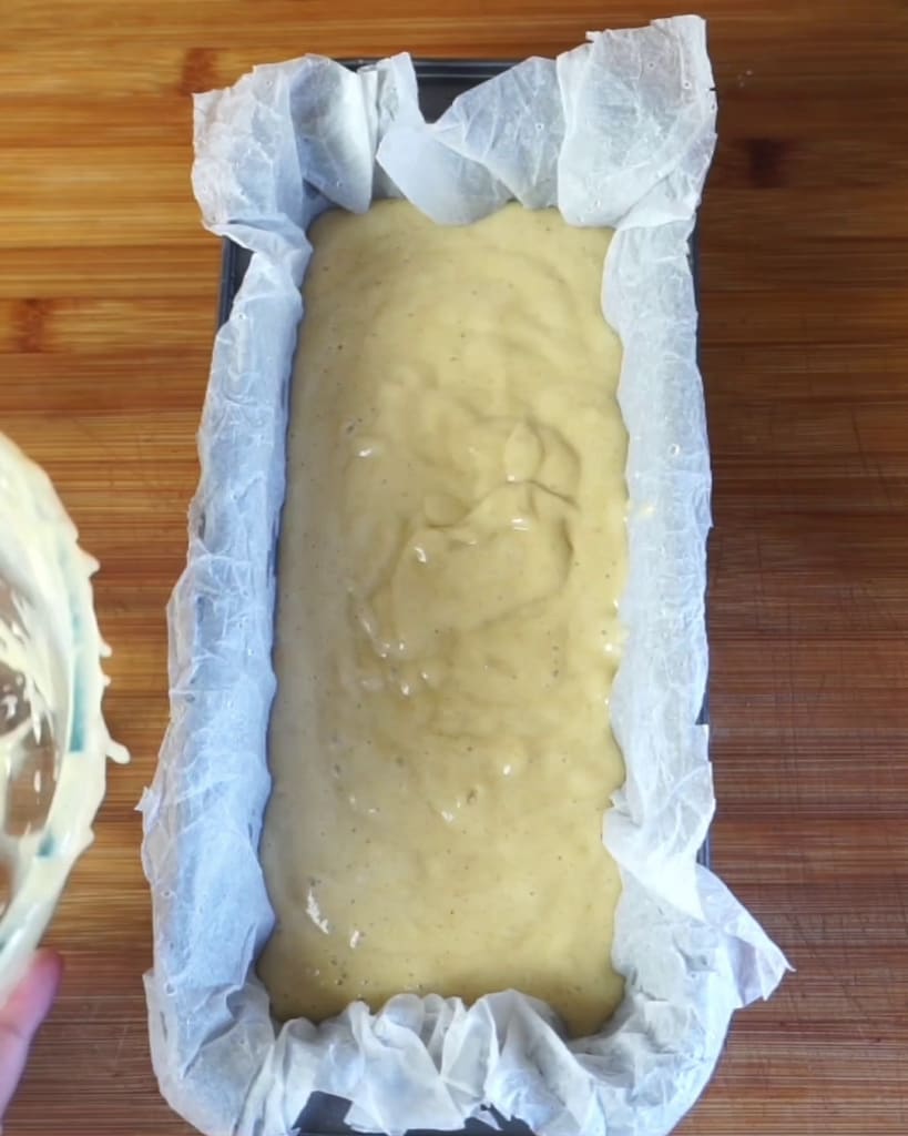 Transfer the banana bread batter into a loaf pan (12 inches) greased or lined with baking parchment.