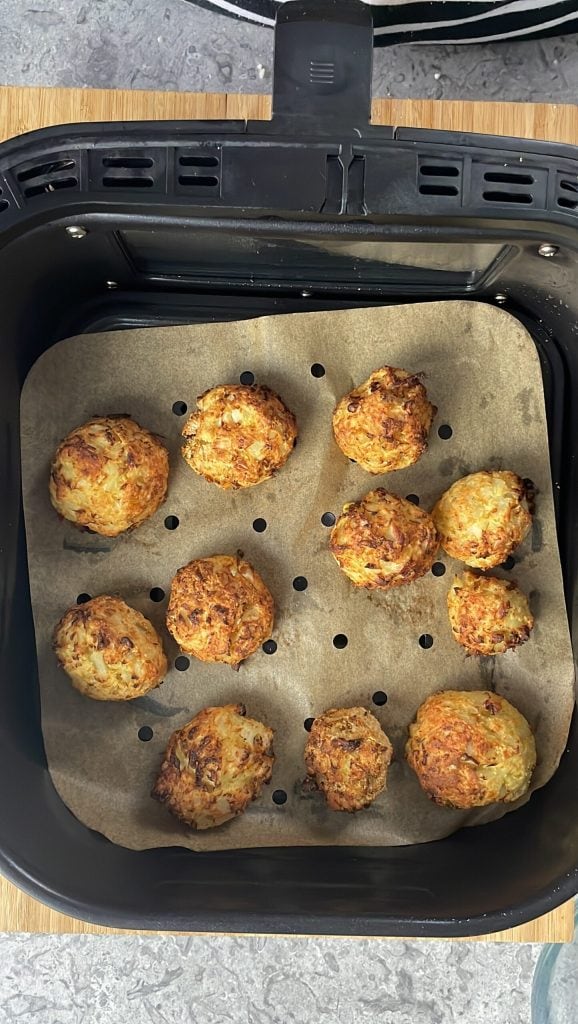 Continue in the same way until all the mixture is used up.Place the meatballs in the basket of the air fryer and cook them at 356°F for 15-20 minutes or until they are well browned.
