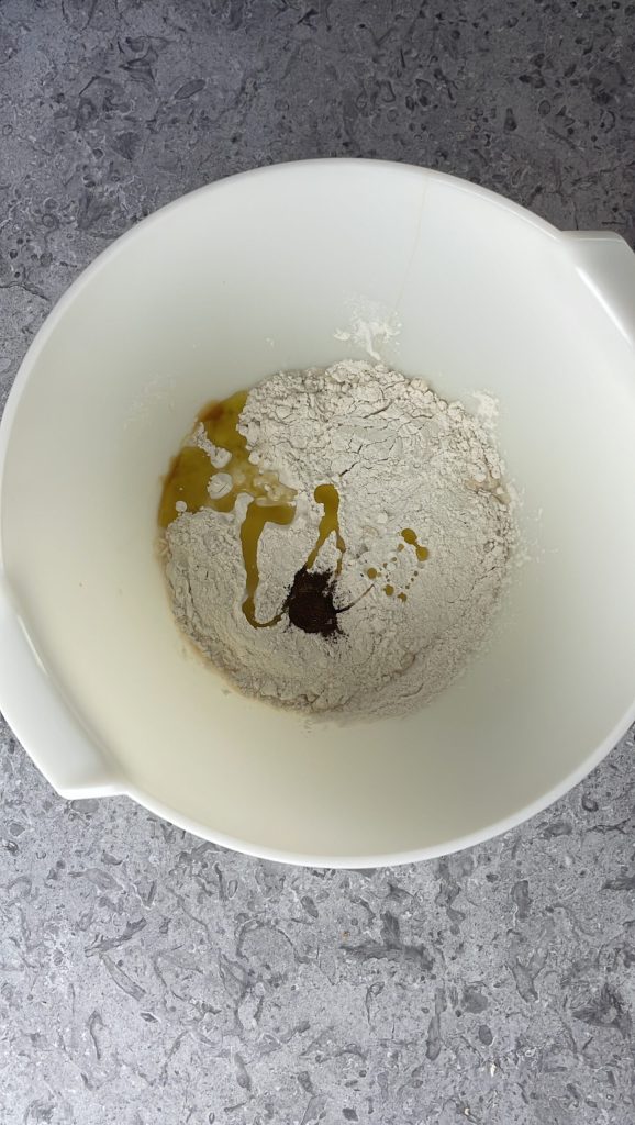 Sprinkle the dry yeast and let it dissolve for 5 minutes.Continue the recipe by adding the barley malt – which you can replace with sugar or honey – Manitoba flour, mild extra virgin olive oil, and vanilla extract.