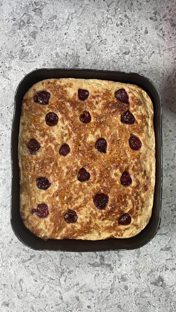 Bake the cherry focaccia in a fan oven at 428°F for 12-15 minutes.