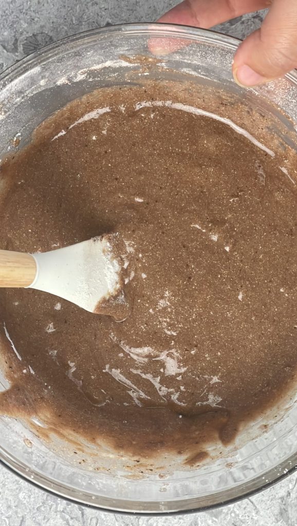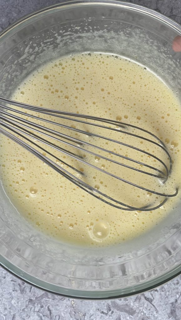• Gradually pour in the sunflower oil and milk while continuing to mix with the whisk.