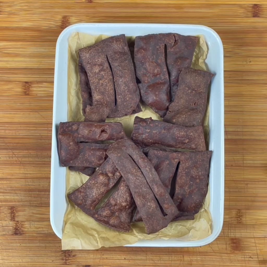 • Fry the cocoa chiacchiere in deep oil at about 350°F in a fryer or in a high-sided pan for about 2-3 minutes.