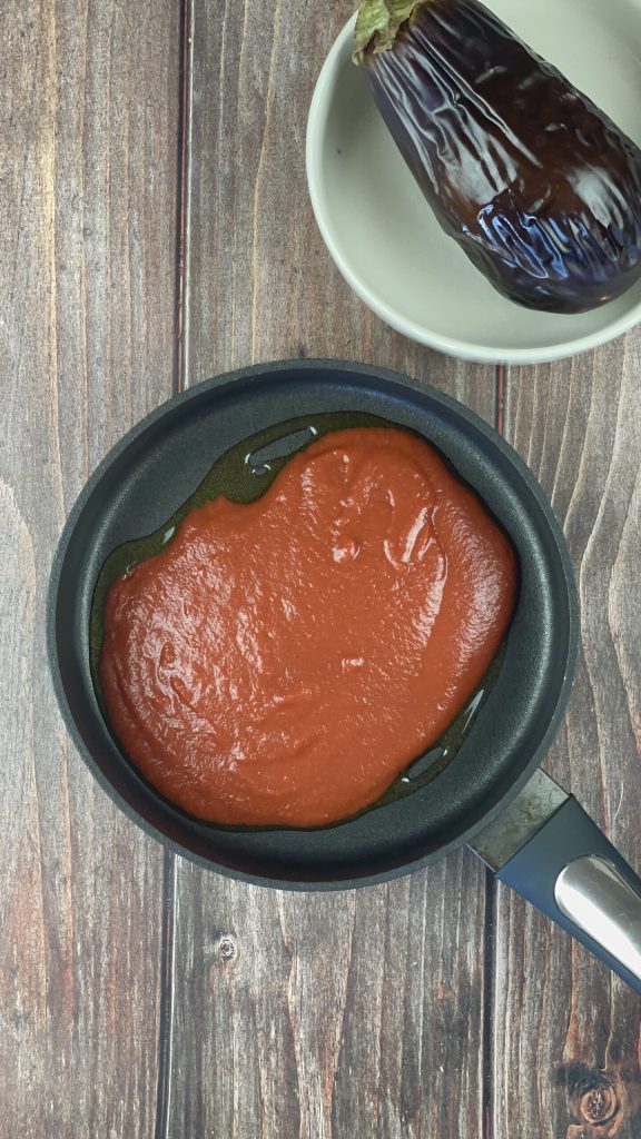 Start preparing the eggplant and tomato sauce by cooking the eggplant.
