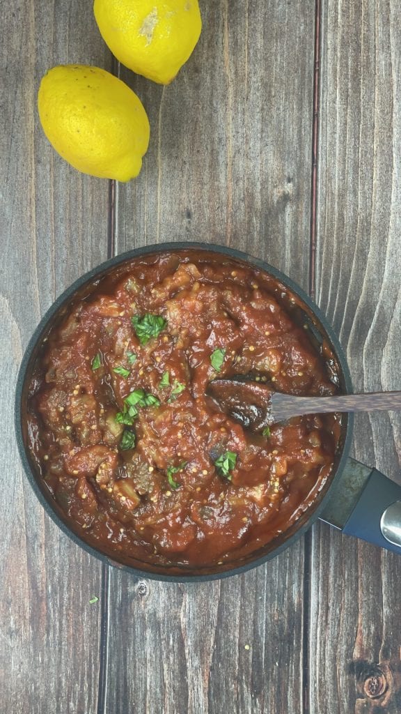 Eggplant and Tomato Sauce, a rich and spicy sauce perfect to eat on its own but wonderful for dressing pasta!