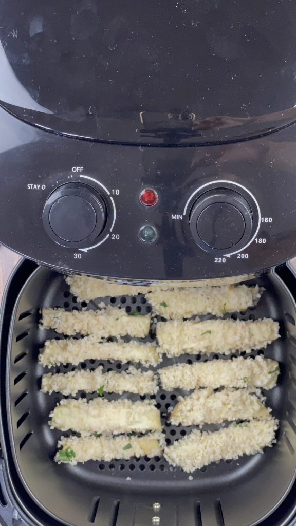 Arrange the eggplant sticks in the basket without overlapping them.Cook the eggplant sticks for 10-12 minutes, turning them halfway through.