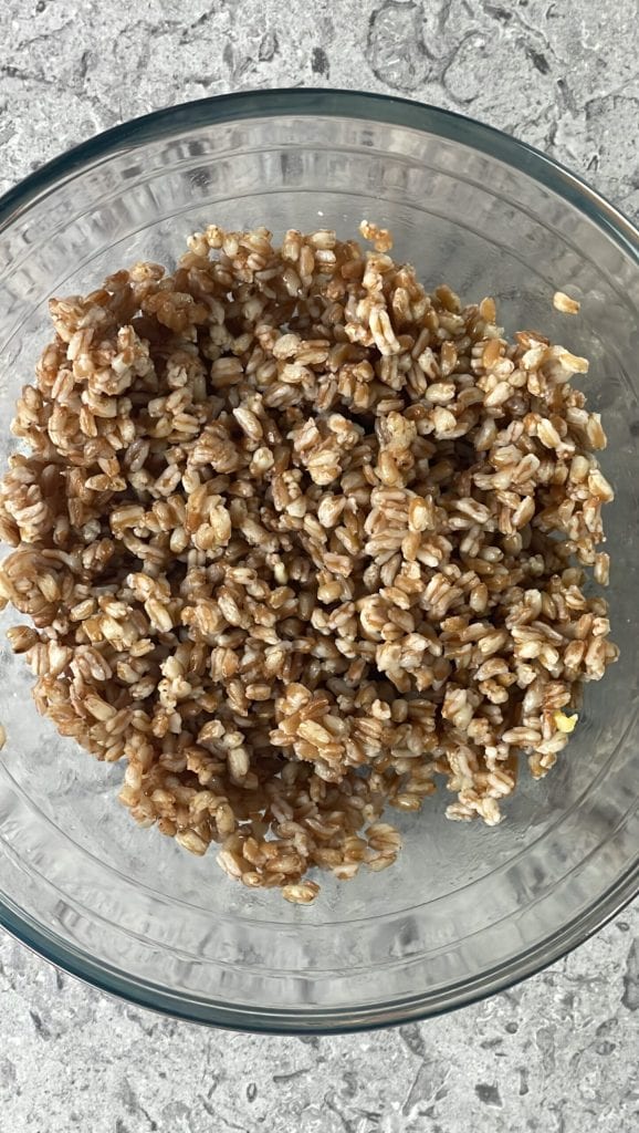Add the seasoned arugula to the farro and mix again with a spoon to distribute it evenly within the salad.