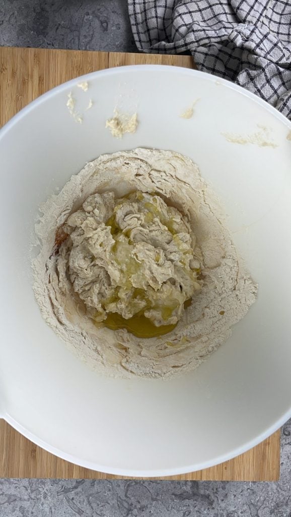 Knead with a spiral hook at medium speed and when the dough starts to combine, pour in a stream 1 tablespoon of extra virgin olive oil.