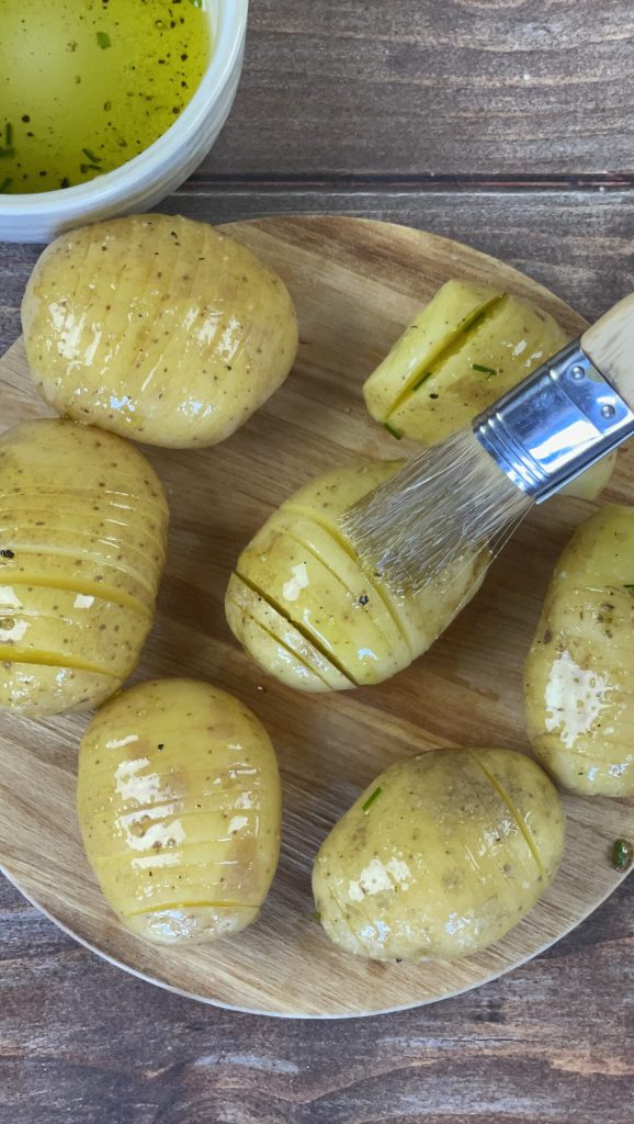 Using two chopsticks or skewers, slice them into thin slices without cutting all the way through with the knife.Brush the sliced potatoes with the prepared seasoning: be generous so that the seasoning gets between the slices.